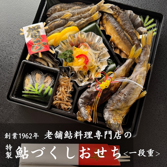 たくさんのご注文ありがとうございました。 2026年もご提供できるよう大切に鮎を育てます。 引き続き応援よろしくお願いいたします。 ※大変お待たせしました。2025年受付開始しました! ※申込期限:2025年12月25日 ※お届け日:12月30日または31日を「備考欄」にてご指定ください。 (発送用おせちはクリスマス後にお作りして28日秋田発の予定です。年始にお届けご希望の方はご相談ください) ⚫️鮎を極めた「特製鮎づくしおせち<一段重>」 地元住民に長年愛されるおせちを1〜2人前用にアレンジしました。古代より縁起の良い魚として用いられる鮎をふんだんに使用し、熟練の職人が手作りした鮎料理の数々は、新春の幕開けを彩るのにぴったりです。2025年は特に大きく育ったこまち鮎をお楽しみください。全国にも類を見ないこだわりが詰まった鮎づくしおせちは、熟練の職人が一つひとつ丁寧に手作りしています。代々守り続けてきた味をぜひご堪能ください。 炭火でじっくり焼いた鮎の塩焼き、風味豊かな鮎の田楽など、鮎の魅力を存分に引き出した逸品を詰め合わせました。おひとり様用おせちに、ご家庭のおせちのお供に。お酒にもぴったりです。手の込んだ逸品揃いのため量産することができません。お申し込みはお早めにお願いします。 秋田県湯沢市産《こまち鮎》使用 ◎鮎の塩焼き◎鮎の田楽◎鮎の唐揚げ◎鮎の甘露煮◎鮎の昆布巻き◎小鮎の甘露煮◎小鮎のマリネ◎しらす鮎の甘露煮(予定) ※1〜2人前 ※特大9寸サイズ(27cm×27cm) ※内容は若干の変更が生じる場合もございます ※便利な冷凍盛付け済です ※お箸はサービスでお入れします(本数指定不可)。祝箸ではありませんのでご了承ください。 申込期限 12月25日(木)入金完了分まで 配達期間 12月30日(火)または31日(水) ※配達日は12月30日か31日のいずれかになります。指定したい場合は備考欄にご記入ください。 ※天候や交通事情等により配送遅延が発生する場合もございます。予めご了承ください。 ※冷凍でお届けとなります。解凍はお召し上がりの1〜2日前に冷蔵庫に入れるか、涼しい場所に置いて解凍してください。 ※写真の祝箸は付属していません。 ⚫️素材へのこだわり - 秋田生まれの《こまち鮎》 使用する鮎は真心込めて稚魚から育てた自社生産の《こまち鮎》。全国的にも珍しい川の水を引き入れ、こだわりの飼育方法で育てた鮎は「天然鮎より美味しい」と、はるばる遠くから訪れるファンもいるほど。 保存料や着色料等一切使用せず、地元の醤油などシンプルな調味料のみで味付けした鮎の加工品の数々は、お土産や贈答品としても重用されています。 ◎鮎の塩焼き・田楽 お店の定番、鮎の塩焼きと自家製味噌使用の鮎の田楽は、職人が一本一本丁寧に串打ちして炭火で焼き上げます。オーブントースターや魚焼きグリルなどで温めると、より美味しくいただけます。 ◎鮎の唐揚げ 老若男女に人気の鮎の唐揚げ。こちらもオーブントースターや電子レンジなどで温めてお召し上がりいただくとより美味しくいただけます。 ◎鮎の甘露煮 炭火で1時間以上じっくり焼き上げることで旨味を凝縮させ、秋田の醤油と砂糖、ざらめで味付けしています。食べ応えのある一品です。 ◎鮎の昆布巻き 炭火でカリッと焼き上げてから、職人が一本一本手作業で昆布を巻いて秋田の醤油、砂糖、清酒で煮込みました。手間暇かけた渾身の一品です。 ◎小鮎の甘露煮 秋田の地元の醤油と砂糖のみで味付けしています。素材の味に自信があるからこそ、シンプルな調味料のみを使用しています。甘露煮は甘ったるくて苦手な方もこれは食べられるという方が多い、甘露煮の概念を覆す甘露煮です。 ◎小鮎のマリネ お酢と砂糖を使用し、爽やかな酸味と鮎の苦味が織りなすハーモニーはまさに新感覚!地元でも好評の一品です。 ◎しらす鮎の甘露煮(予定) 超希少!小鮎よりさらに小さなしらす鮎もお入れする方向で調整中しています。どうぞお楽しみに! ●お召し上がり方法 お召し上がりの1〜2日前に冷蔵庫に入れるか、涼しい場所に置いて解凍してください。便利な冷凍盛り付け済です。 ●生産者のこだわり 自然に近い環境で、真心込めて稚魚から鮎を育てて創業62年。 秋田県は気温が低く他地域の鮎より小ぶりではありますが、そのぶん身が詰まった脂の乗った鮎を育てています。小野小町ゆかりの地が点在することから、この地で育まれた鮎を《こまち鮎》と名付け代々継承しています。 まだ雪深い頃は豊富な水量、鮎に適した水温の恵まれた地下水で育て、雪解けの頃に秋田随一の清流・雄物川(おものがわ)の川の水を引き入れ、より自然に近い環境にすることで、"香魚”の名にふさわしい味が濃く香り高い、天然の鮎に近い鮎に成長します。