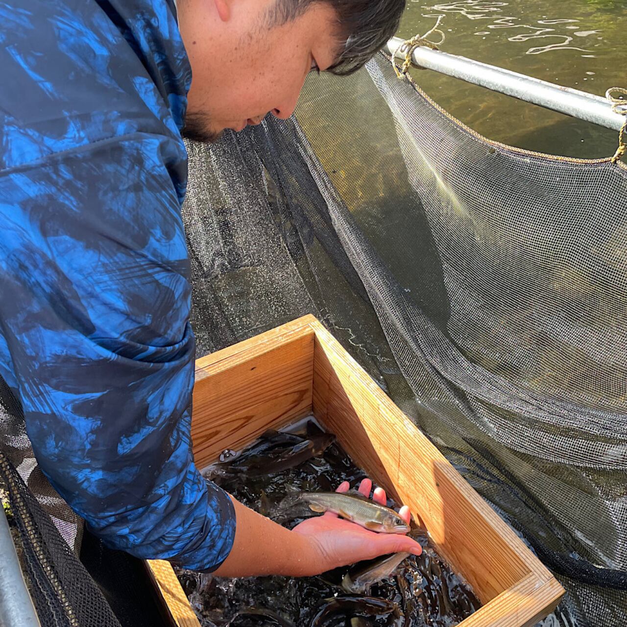 鮎の状態を確認しながら毎日3回数十万匹の鮎に手作業で餌を与えています。デリケートな魚なので、餌をしっかり食べられているか、運動は足りているかなど健康状態に常に気を配っています。