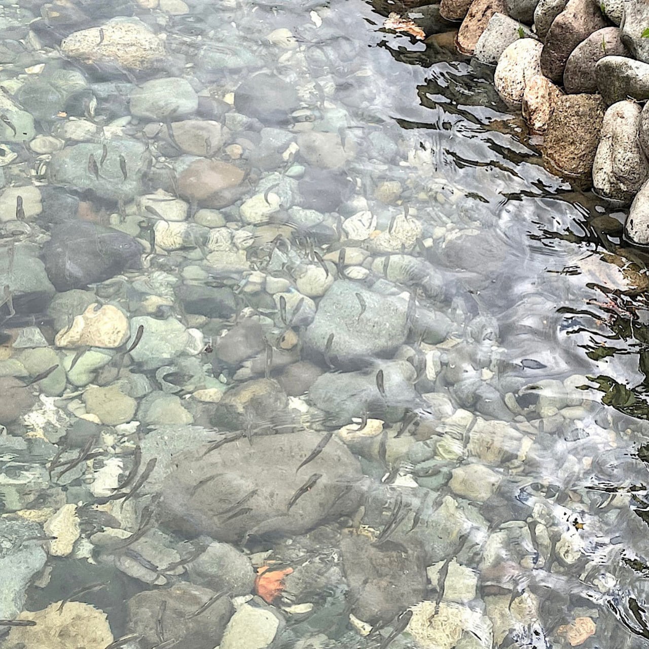 鮎の状態を確認しながら毎日3回数十万匹の鮎に手作業で餌を与えています。デリケートな魚なので、餌をしっかり食べられているか、運動は足りているかなど健康状態に常に気を配っています。