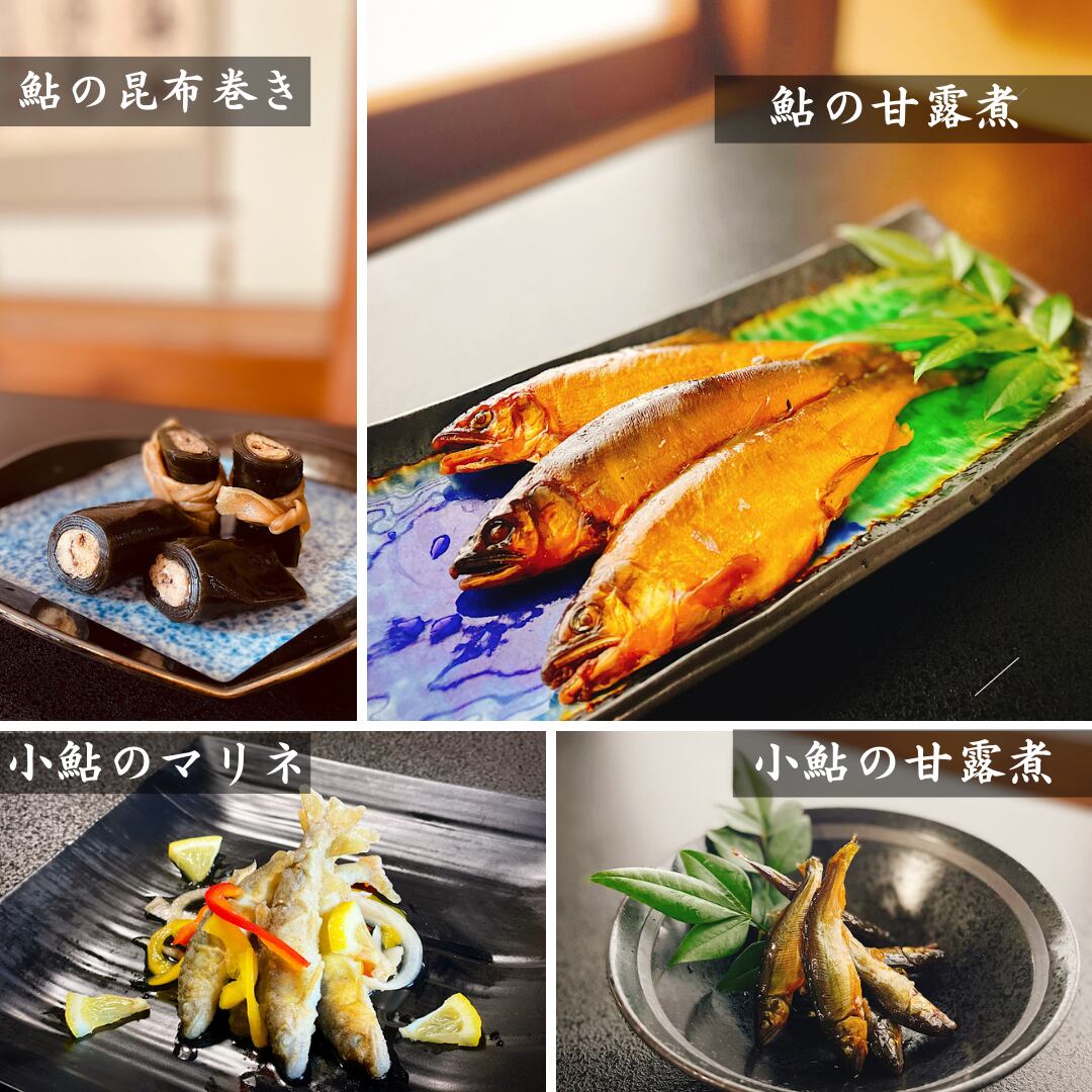 ◎鮎の塩焼き◎鮎の田楽◎鮎の唐揚げ◎鮎の甘露煮◎鮎の昆布巻き◎小鮎の甘露煮◎小鮎のマリネ